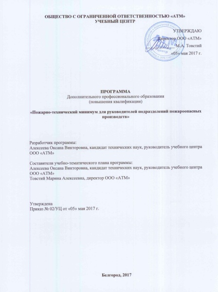 07. Программа дополнительного профессионального образования повышения квалификации «Пожарно-технический минимум для руководителей подразделений пожароопасных производств»